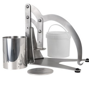 This Dutch cheese press has 50 pounds of pressing power, achieved by hanging 12.5 pounds from the arm. The press is designed to have a consistent 4:1 weight ration. This cheese press makes up to 3 pounds of cheese. Plus it is made from stainless steel, making it easy to keep clean and sanitized. It is dishwasher safe once the feet are removed.
